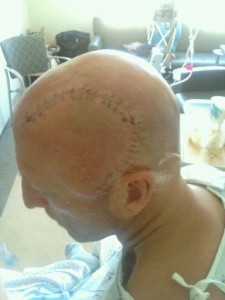 Last Wednesday, the stitches were taken out. It’s amazing, a person can’t really tell that the same old scar was again opened up, the same tumor,(a little less in size), was again taken out, and the scar was closed up again. The medical team was so unbelievable, in regards to so many things that they did, from the operation, to the after care, to following up on my rehab/walking, again, I just have words of praise for UCLA. Dr. Yang wanted to take the stitches out, and also answer any questions that I might have, along with taking a few steps that might need to be taken with my swollen area around the scar. He pulled out 20cm of blood out of my head. What that means, is one HUGE container of blood that he wanted to be tested in about 5 different tests, to make sure all was o.k. Everything came back negative, so all was good.